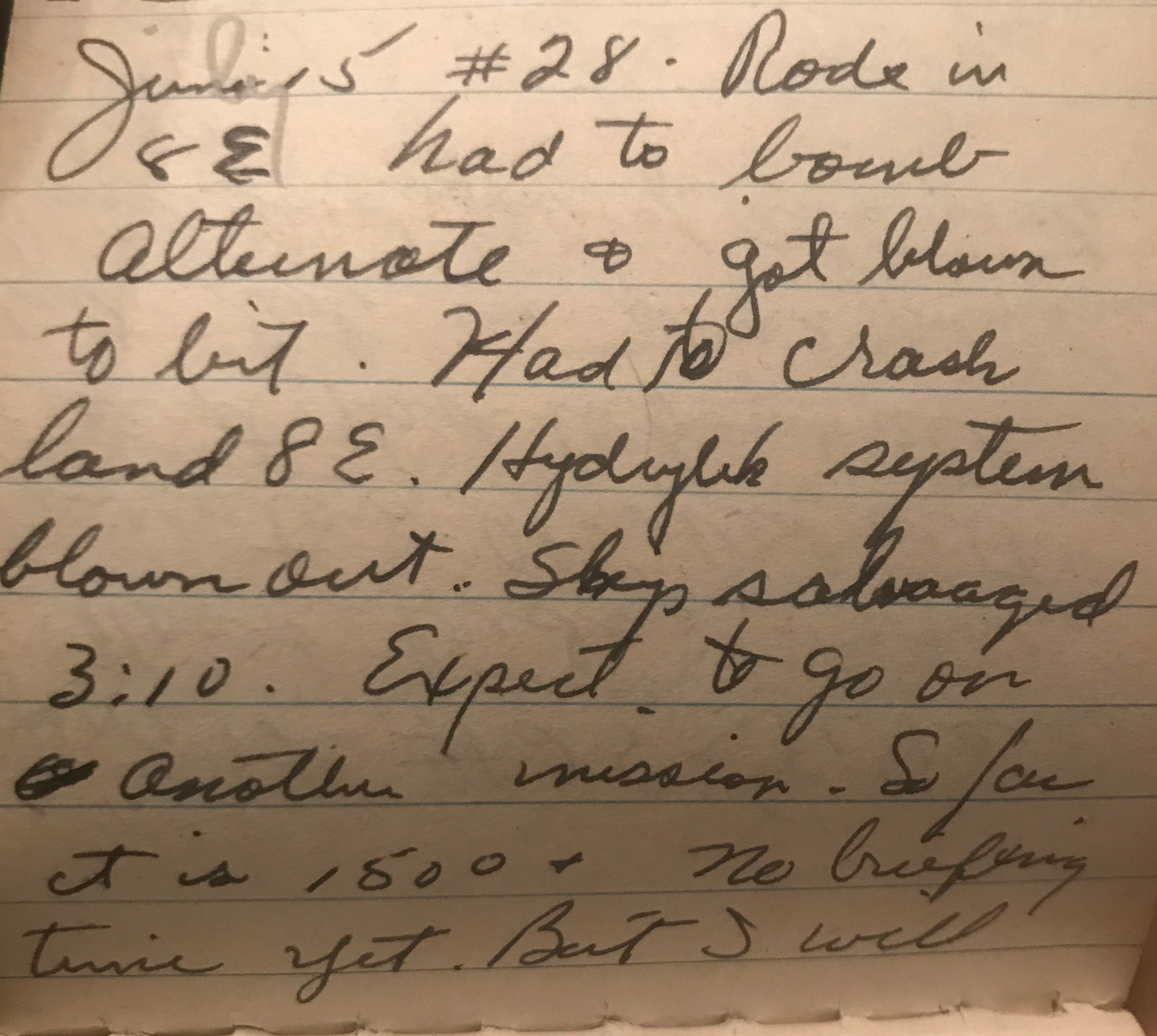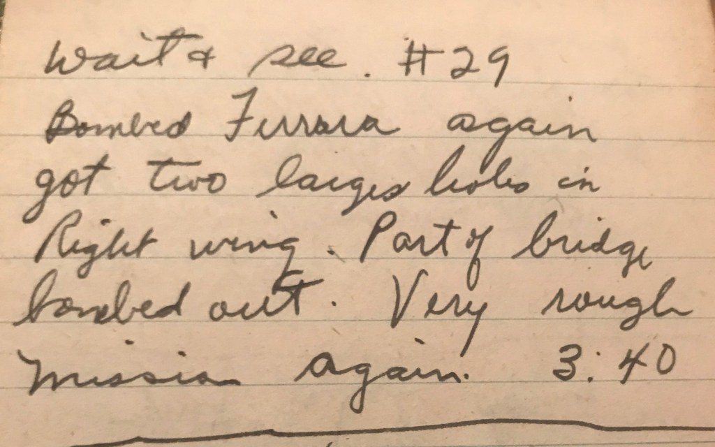 Then later that day, “bombed Ferrara again…got two large holes in right wing. Part of bridge bombed out. Very rough mission again.”