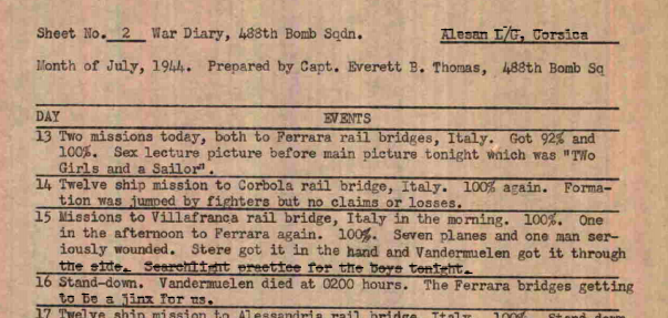 However, this mission ends tragically with the loss of a comrade. As noted in the War Diary of the 488th, “…Vandermuelen got it through the side.” The next day, Vandermuelen died from injuries incurred during the mission on July 15th. As noted in the 488th Bomb Squadron War Diary,